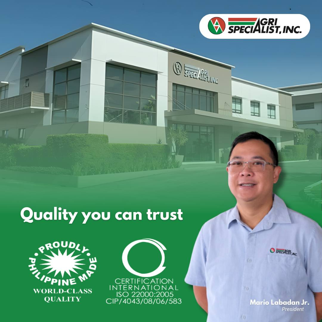 AgriSpecialist, Inc. values quality, excellence, and integrity to be in the service of its clients, customers, and other stakeholders. As testament to this commitment, we were granted the "Proudly Philippine Made Seal of Excellence" and an ISO 22000:2005 for Food Safety Management System.